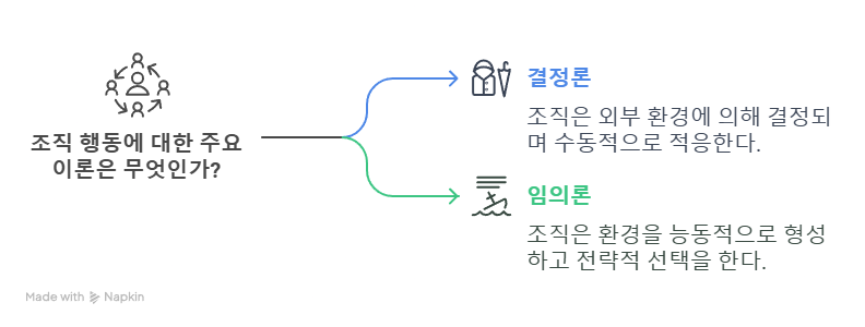 | 전략적 선택이론 | 조직 구조와 전략은 경영진의 전략적 선택에 의해 결정됨 | 경영진의 자율성과 리더십을 강조하며, 환경에 대한 능동적인 대응 가능성을 제시함 | 환경의 제약 및 영향력을 과소평가할 가능성이 있음 |