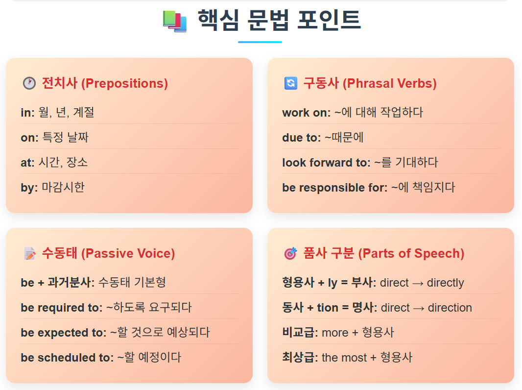 - 전치사와 구동사: on time, due to, work on, look forward to 등