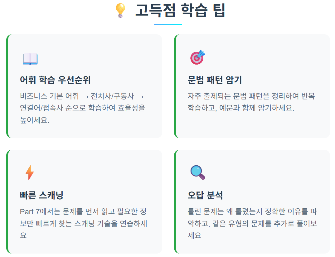 - Part 5: 문항당 30초 목표 (총 7.5분)