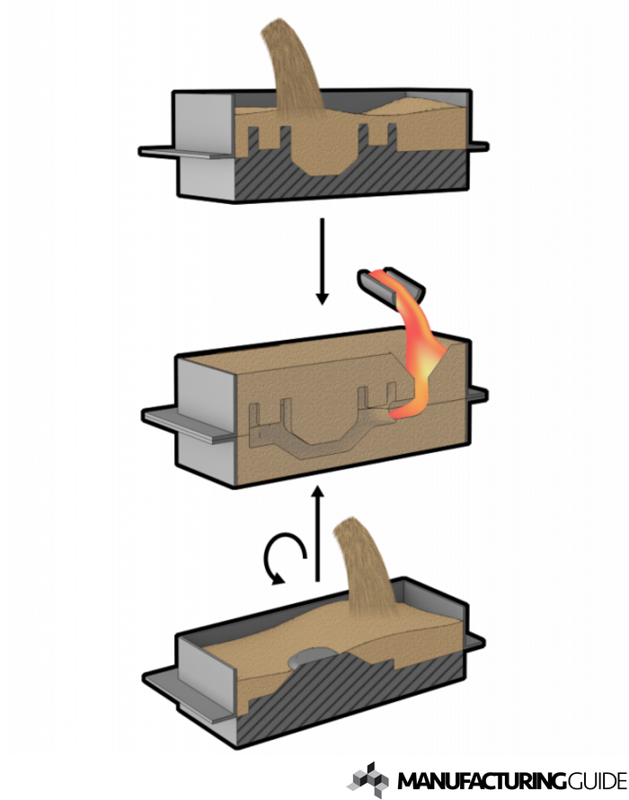 생사 주조: 이 방법은 모래, 점토 및 물의 혼합물을 사용하여 주형을 만듭니다. 패턴을 모래에 눌러 주형 구멍을 만든 다음 주형을 건조시키거나 구워서 굳힙니다.